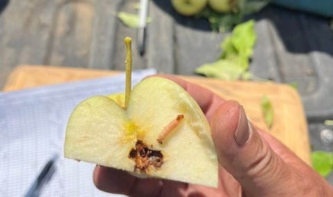 Investigating apple worm damage.